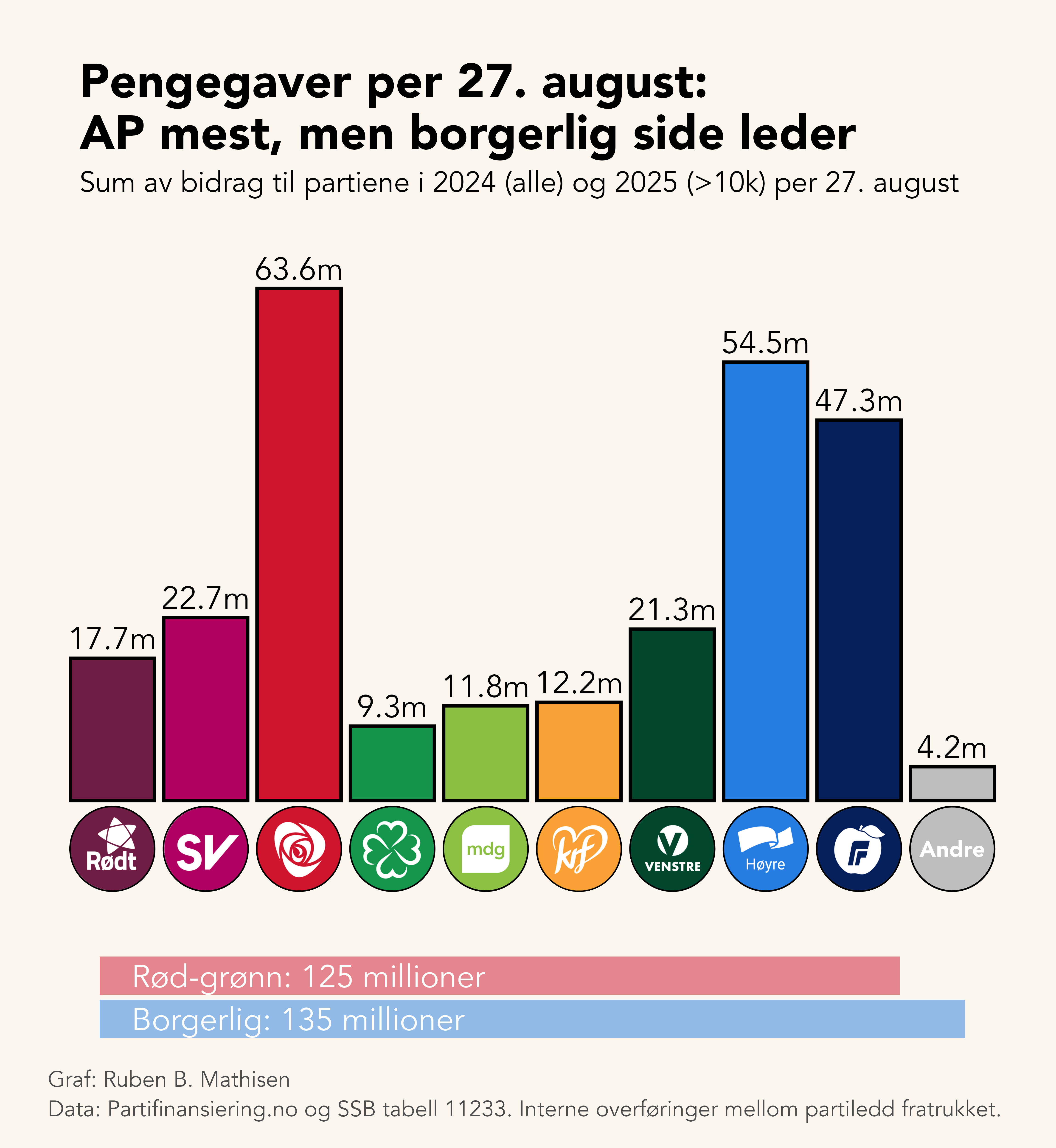 Tallene viser at borgerlig side så langt har fått inn mest med 135 millioner—mot rød-grønn side sine 125 millioner. Av enkeltpartier er det Arbeiderpartiet som har fått mest (64 millioner)